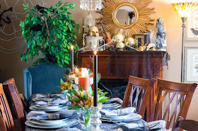 | Our guests will actually be dining in the living room next to the fireplace and under the "chandelier." A large beaded spiderweb spans the corner, while ravens and crows look on from their various perches around the room. |